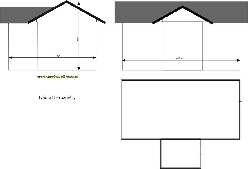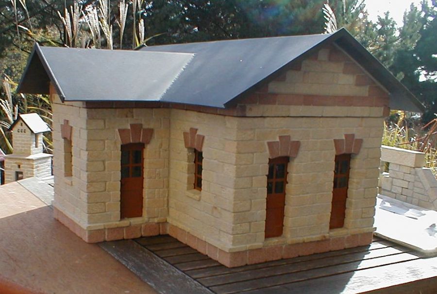 Nádražní budova z pískovce. Vyrobeno z přírodního pískoce. Okna z nerezového plechu tl. 1 mm zasklená křemičitým sklem. Střecha odnímatelná pro snadný přístup k případným instalacím, vyrobena z ocelového plechu tl. 2 mm, šopována zinkem a černě lakována. 100 % mrazuvzdorná stavba.