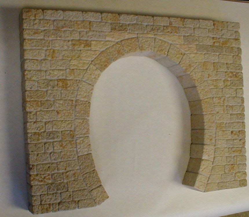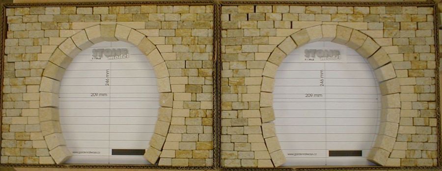 Stavebnice robustního tunelového portálu z přírodního pískovce, vnější rozměr 305 x 405 mm, tloušťka stěny 40 mmm.Čelní je vyrobena z pemrlovaných kostek.